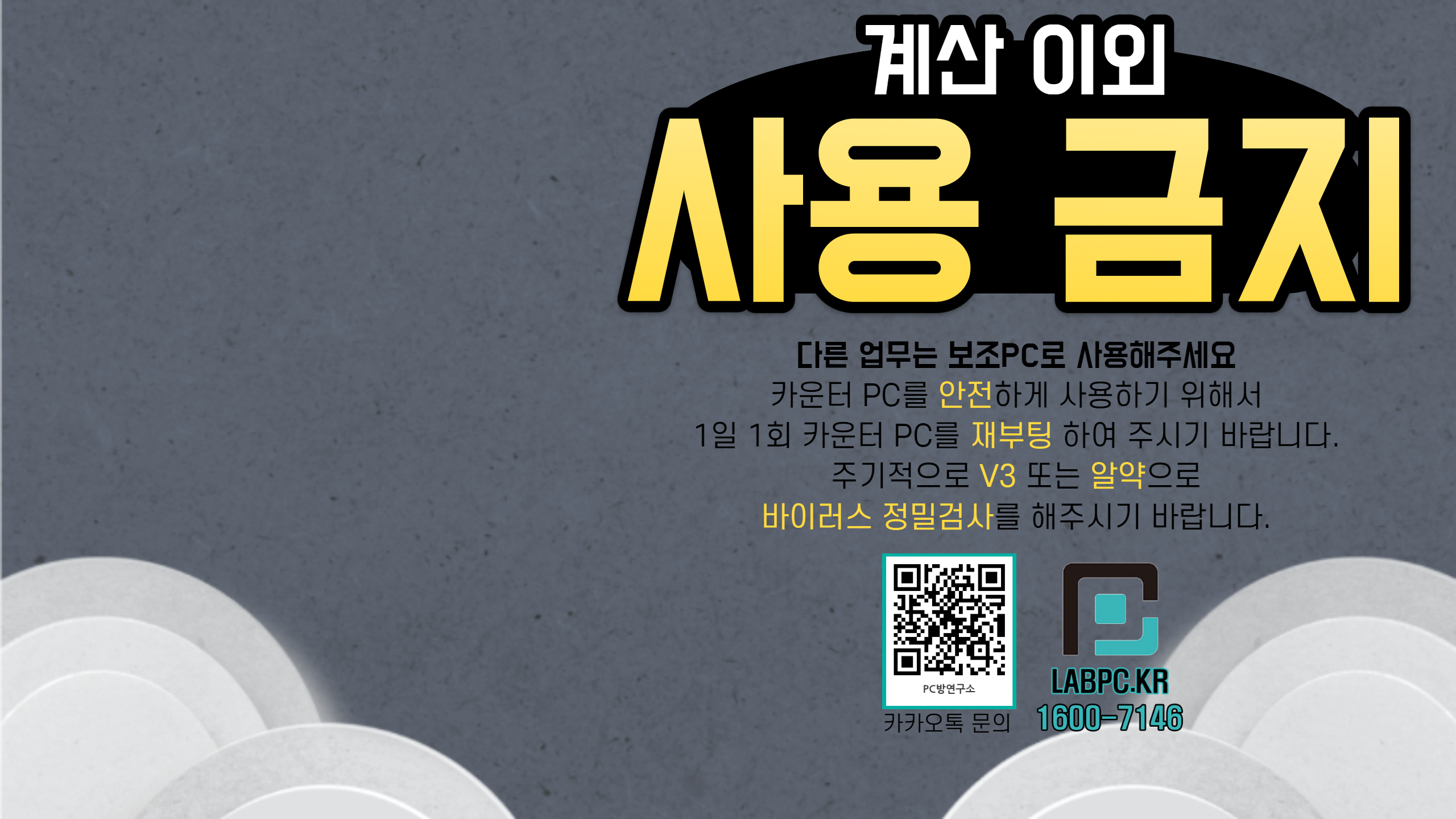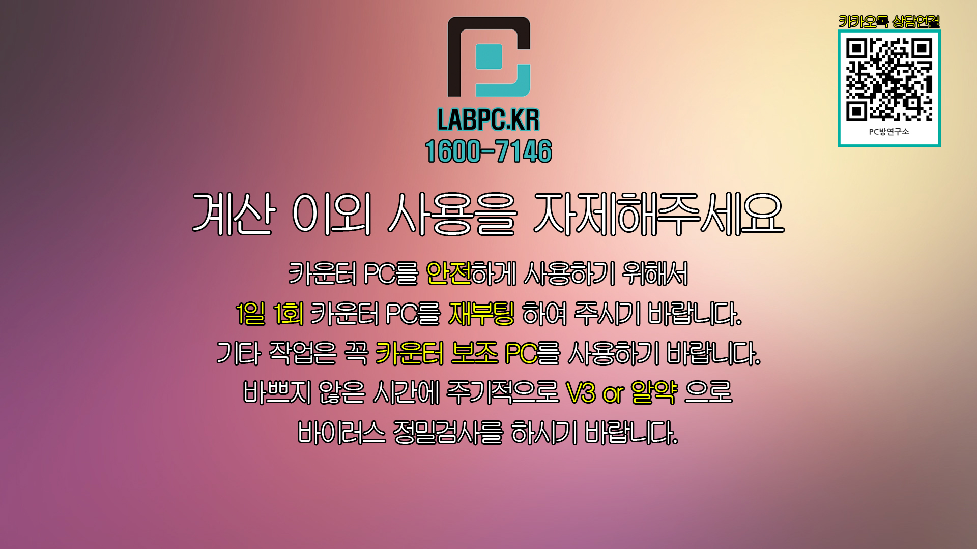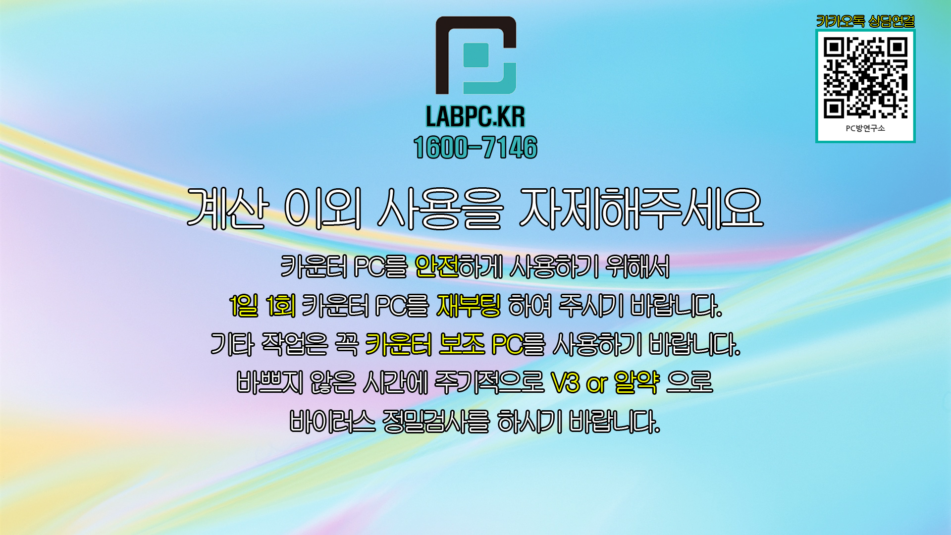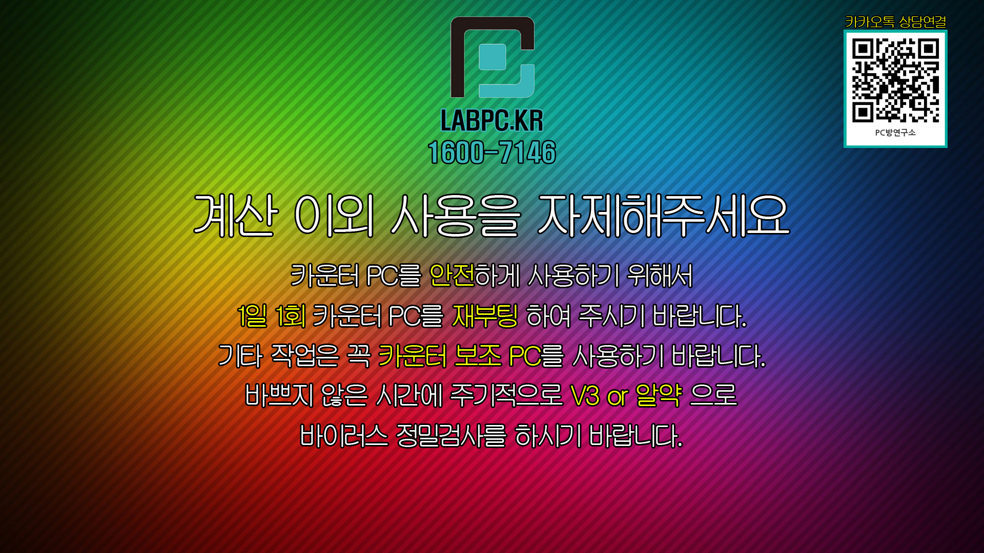 카운터 배경화면 공유합니다.(대표번호, 카카오톡 QR코드 포함) 공지사항 2020. 9. 24. 14:39 계산 외 사용금지 문구와 PC방연구소 대표번호, 카카오톡 연결 QR 코드 표시 해두었습니다. 카운터배경(카톡).zip 6.00MB 다운로드 받으셔서 카운터 배경화면으로 사용하시면 됩니다. 공유하기 게시글 관리 PC방연구소